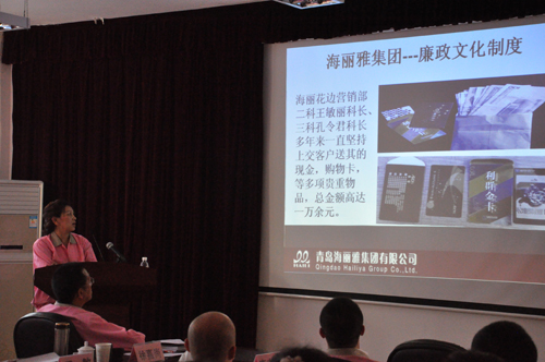 會議在《海麗雅八榮八恥》誓言中正式開始,隨后全體參會人員飽含真情共唱《海麗雅之歌》。歌聲結束,億和海麗公司常務副總經理楊光對大家進行《銷售自己》培訓,與大家共同分享自己多年的營銷經驗、傳授營銷技能,博得陣陣掌聲。會上,集團黨支部書記、副總經理崔俊芬就《廉潔自律文化建設》進行培訓,廉潔建設伴隨海麗集團的成立已有近百年的歷史,工作中大家廉潔自律,收到客戶送來的禮品、禮金及時足額上交的氛圍濃厚,在公司董事長的帶領下,發揚廉潔風氣,讓“廉潔做事、廉潔做人”在每一個參加培訓人心里生根發芽。