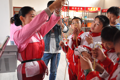 體驗結束湖島路小學學生主動找到講解員學習更多的結繩自救方法