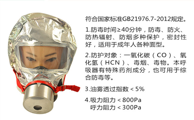 1、濾芯為進(jìn)口觸酶霍加拉特,充分過(guò)濾濃煙中的有害氣體,提供40分鐘的有氧呼吸;