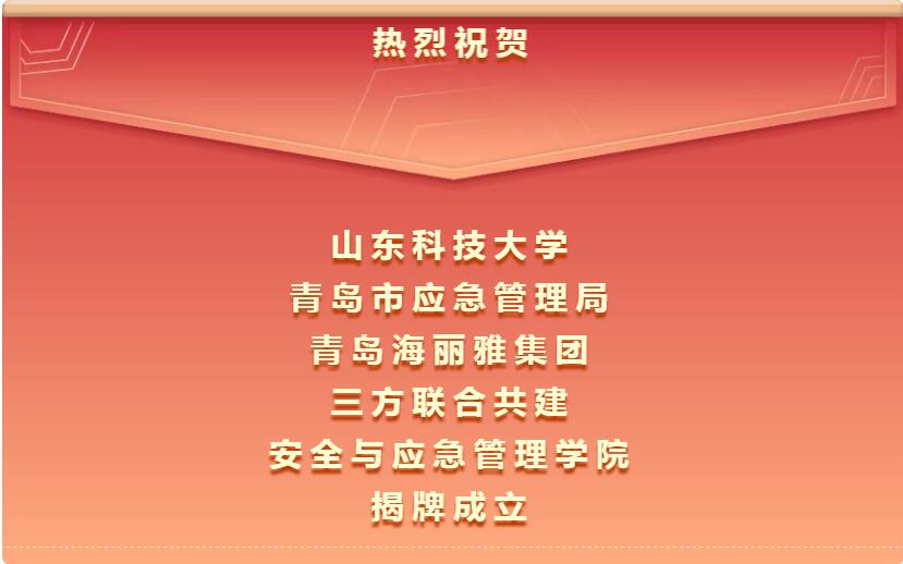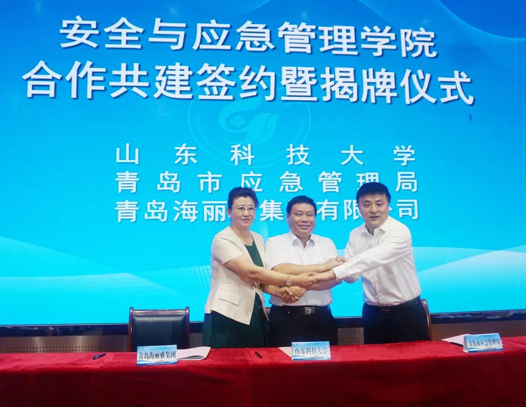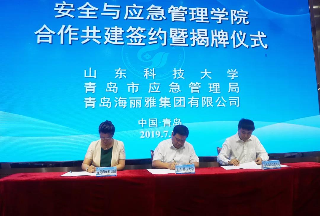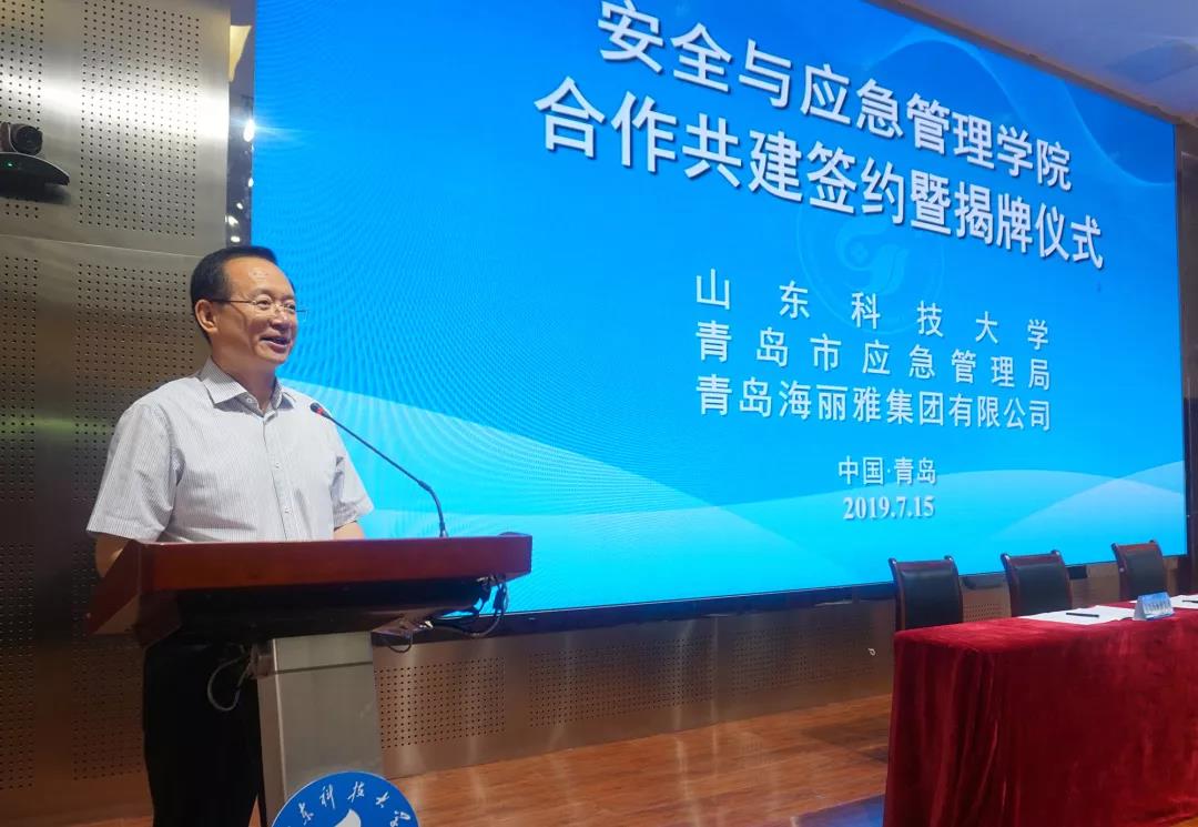 2019年7月15日,山東科技大學、青島市應急管理局、青島海麗雅集團三方聯合共建的“安全與應急管理學院”舉行揭牌儀式。中央黨校(國家行政學院)應急管理培訓中心(中歐應急管理學院)主任(院長)/中國應急管理學會副會長馬寶成、山東科技大學黨委書記羅公利、  青島市政府副秘書長萬建忠、青島市應急管理局局長張建剛、青島海麗雅集團董事長張旭明出席會議。