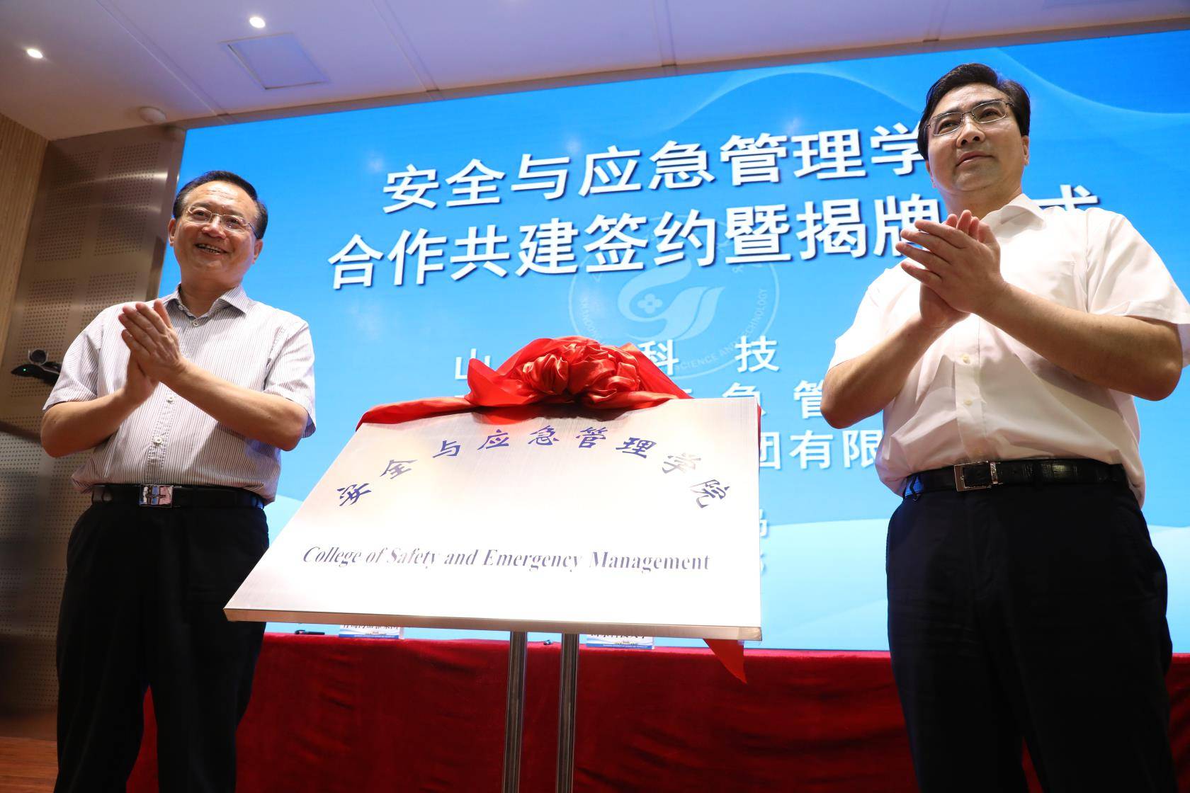 山東科技大學黨委書記羅公利(左)、青島市政府副秘書長萬建忠(右)為“安全與應急管理學院”揭牌
