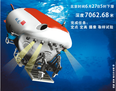 北京時間6271147分,中國“蛟龍”再次刷新“中國深度”——下潛7062米。63,“蛟龍”出征以來,已經連續書寫了5個“中國深度”新紀錄:6156671米;6196965米;6226963米;6247020米;6277062米。“很激動也很興奮,作為研制和試驗人員,我為‘蛟龍’號的表現感到自豪和驕傲。” 完成突破7000米深度目標,回到母船甲板的首席潛航員葉聰說,此次下潛比前面幾次下潛往前跨了一步,突破7000米深度,并且按照預定計劃,完成了坐底、拍攝海底景象、取水樣和布放標志物等活動,取得了7000米海底的珍貴資料,證明了“蛟龍”在7000米級深度具備良好作業能力。