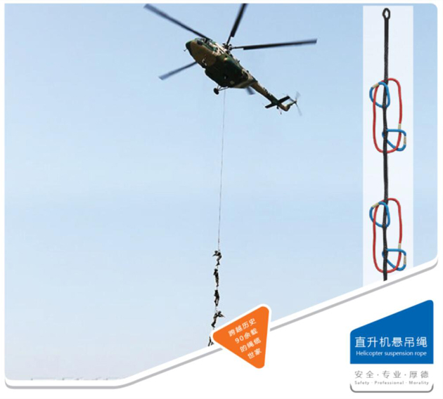 特殊的環眼編插設計,成功實現直升機多人同時懸吊,集體速降和撤離。在訓練中,懸吊在直升機下方的特戰隊員不僅要面對恐高和強風的考驗,還要克服繩索轉動帶來的眩暈感,極大考驗了官兵的身體和心理素質。直升機懸吊繩采用質量輕、強度高、耐磨損抗老化的超高分子量聚乙烯材質進行主繩編織,給予特戰隊員貼心的保護,可靠的安全保障。
