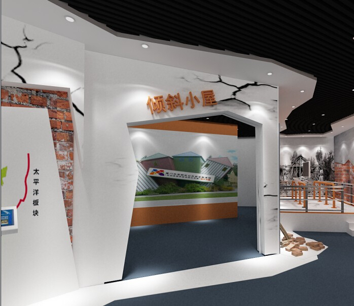 地震傾斜小屋展示目的:模擬一間建筑結構被地震損壞的房間,走進這里參觀者會有身臨其境的感覺。 地震傾斜小屋展示方式:參觀者走進地震傾斜小屋,傾斜小屋通過地板與墻壁的傾斜,房屋內的裝飾及窗子均平行傾斜,因此當參觀者走進小屋時,并沒有感覺到房間是傾斜的,位于房間內的裝飾環境同樣也是傾斜的,參觀者走進其中會有強烈的眩暈感,在小屋墻壁的四周會設置一些扶手,防止參觀者在參觀途中跌倒。