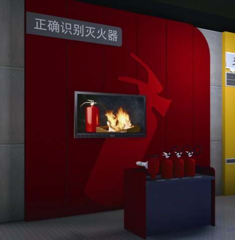 正確識別滅火器裝置展示方式:利用滅火器實物和電視機播放聯動的形式展示,滅火器實物經過改造安裝信號識別設備,根據電視播放的多媒體內容,觀眾選擇相應的滅火器進行滅火。