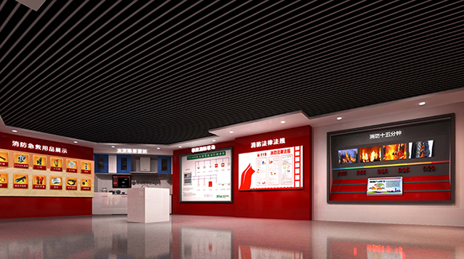 消防器材展示(人機互動設備)、聲光報警、電子滅火、煙霧逃生通道(整套煙霧逃生走廊)、煙霧走向演示、消防知識搶答、消防標志識別、消防聯動演示、安全警示教育館查找火災隱患。